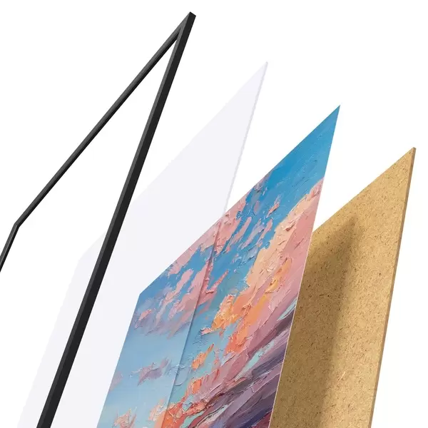 De poster bestaat uit een frame, plexiglas, geprinte afbeelding en spaanplaat achterkant. De poster kan meteen aan de muur worden gehangen dankzij de bevestigingen op de achterkant.