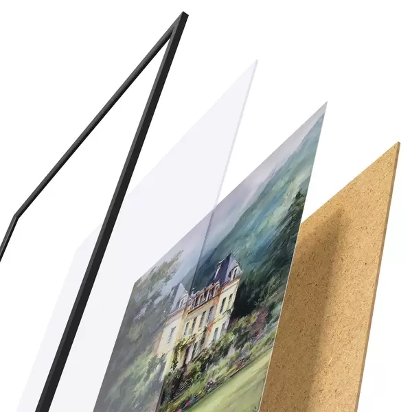 De poster bestaat uit een frame, plexiglas, geprinte afbeelding en spaanplaat achterkant. De poster kan meteen aan de muur worden gehangen dankzij de bevestigingen op de achterkant.