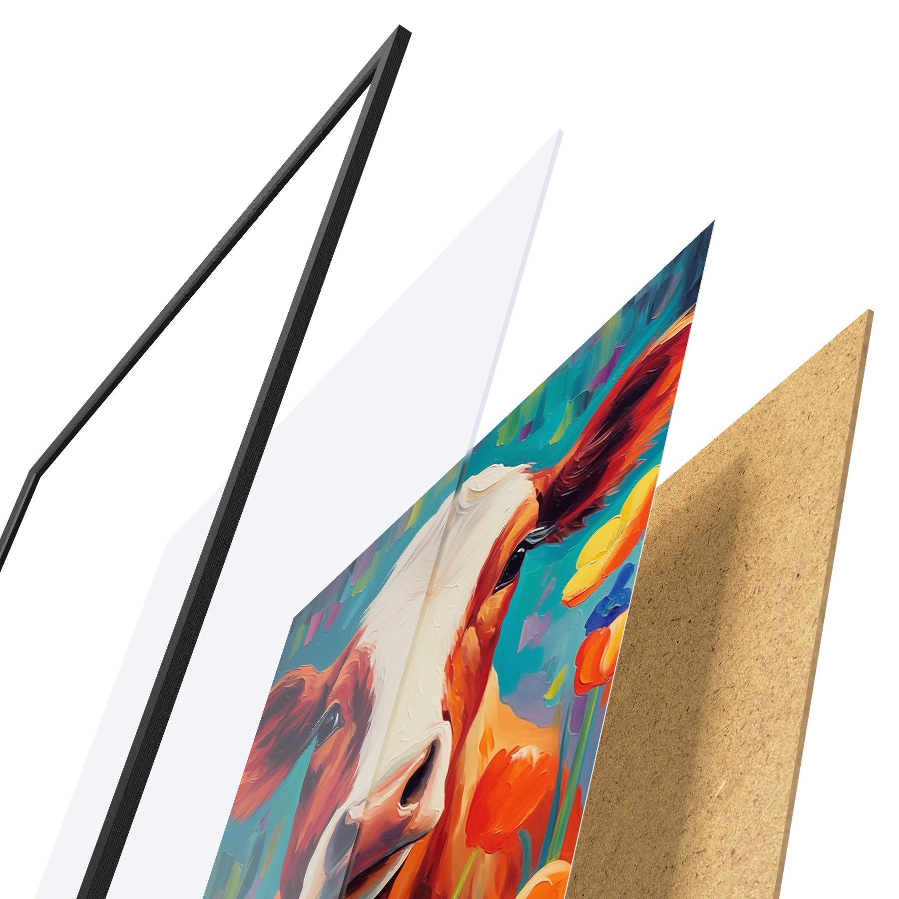 De poster bestaat uit een frame, plexiglas, geprinte afbeelding en spaanplaat achterkant. De poster kan meteen aan de muur worden gehangen dankzij de bevestigingen op de achterkant.