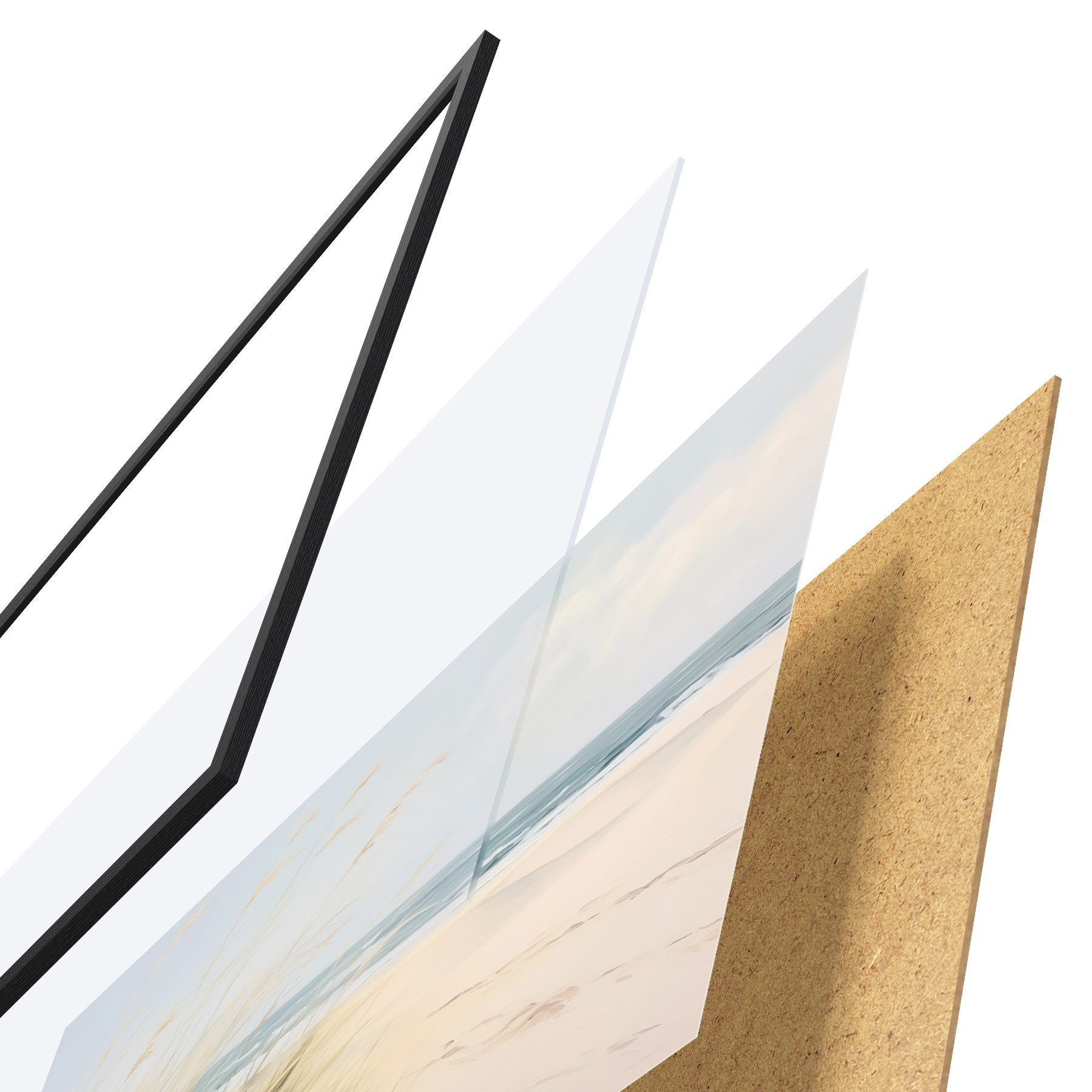 De poster bestaat uit een frame, plexiglas, geprinte afbeelding en spaanplaat achterkant. De poster kan meteen aan de muur worden gehangen dankzij de bevestigingen op de achterkant.