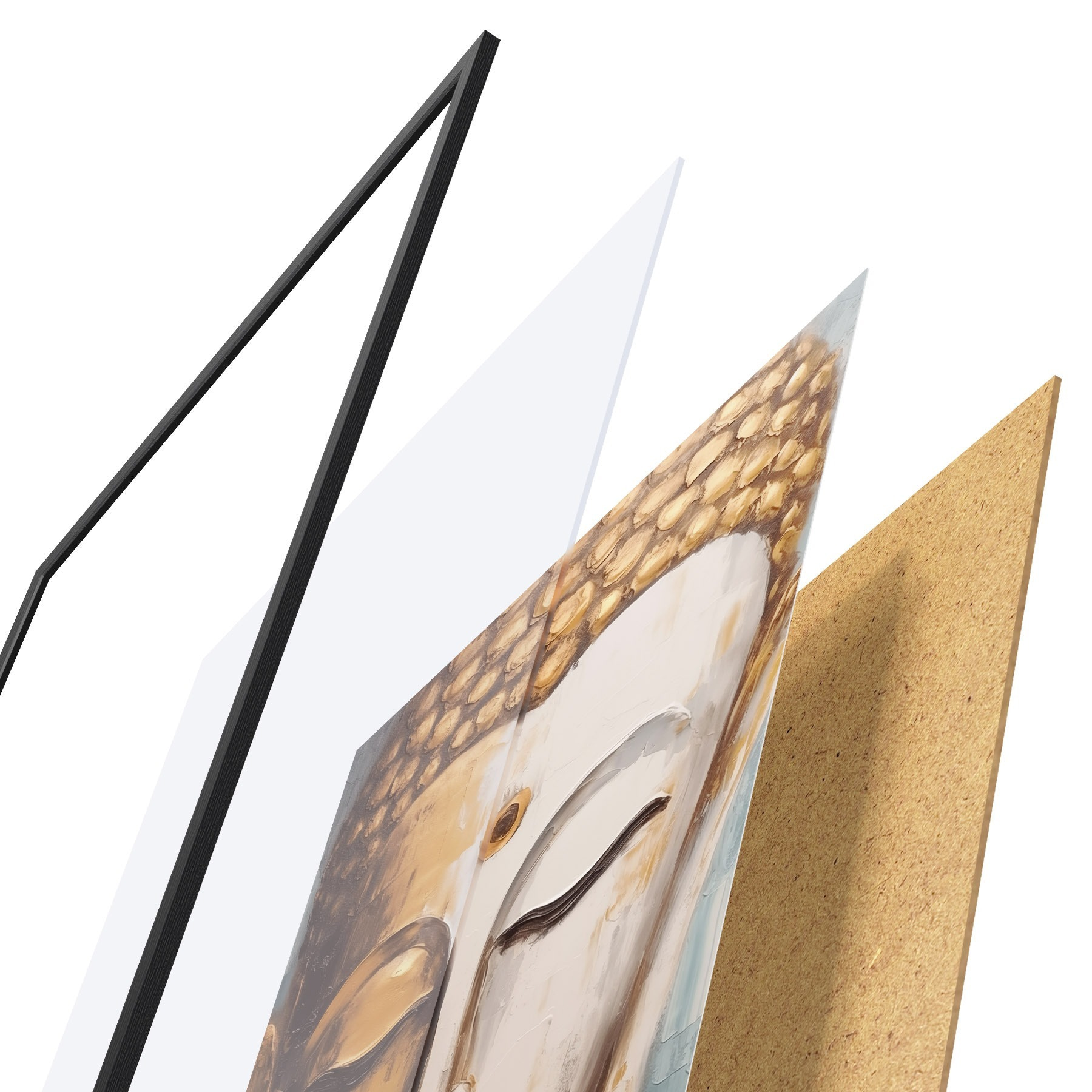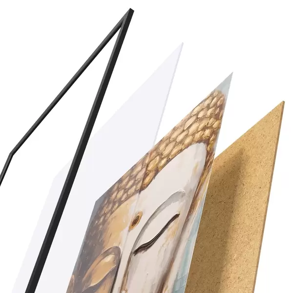 De poster bestaat uit een frame, plexiglas, geprinte afbeelding en spaanplaat achterkant. De poster kan meteen aan de muur worden gehangen dankzij de bevestigingen op de achterkant.