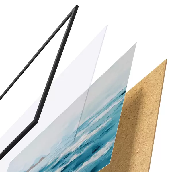 De poster bestaat uit een frame, plexiglas, geprinte afbeelding en spaanplaat achterkant. De poster kan meteen aan de muur worden gehangen dankzij de bevestigingen op de achterkant.
