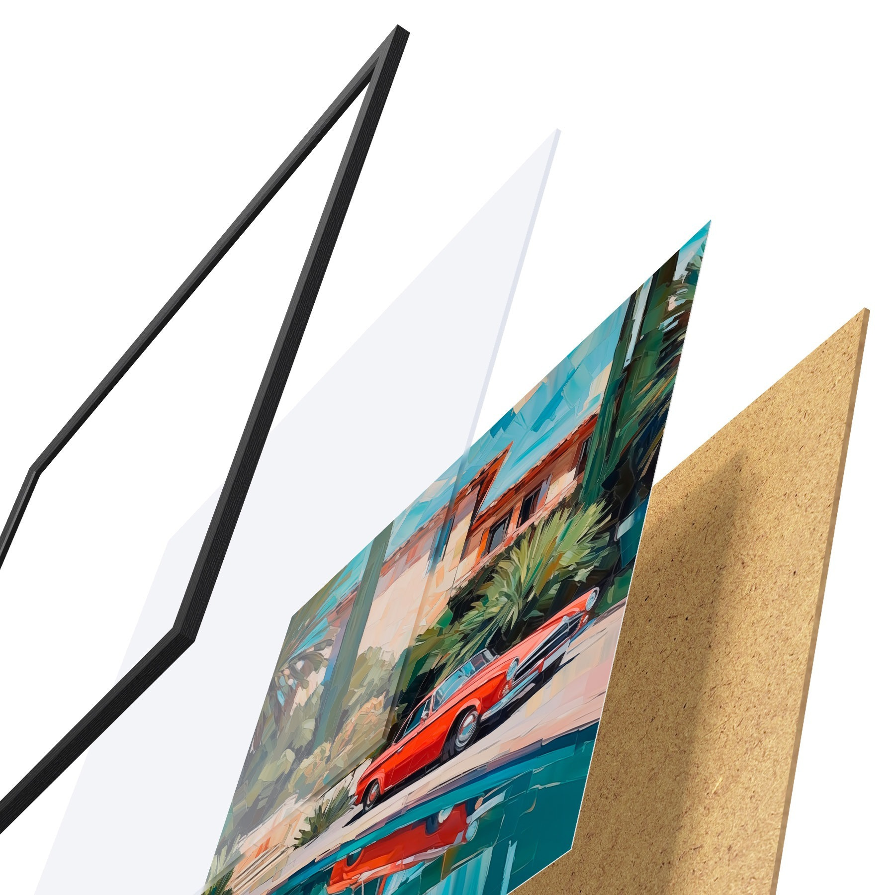De poster bestaat uit een frame, plexiglas, geprinte afbeelding en spaanplaat achterkant. De poster kan meteen aan de muur worden gehangen dankzij de bevestigingen op de achterkant.