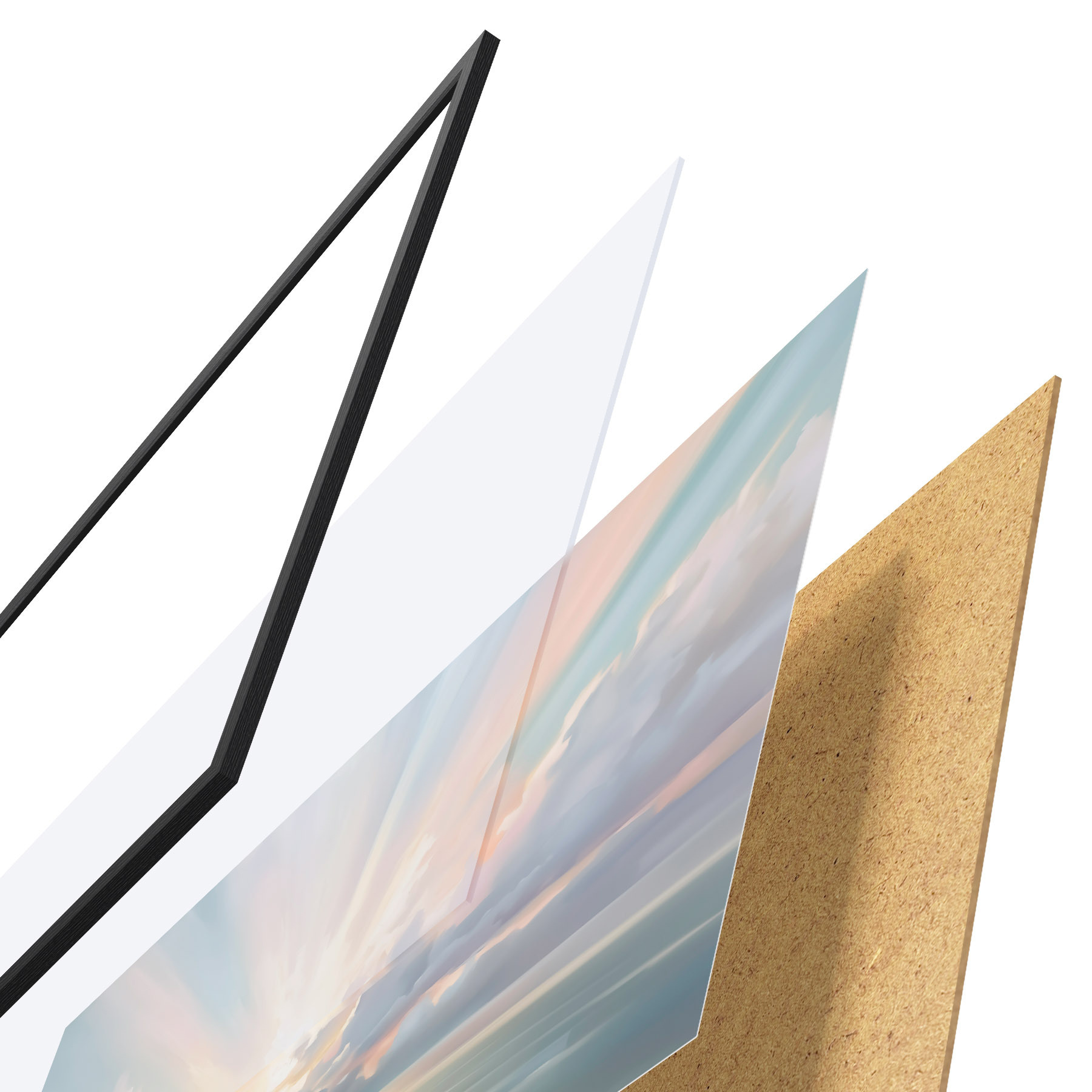 De poster bestaat uit een frame, plexiglas, geprinte afbeelding en spaanplaat achterkant. De poster kan meteen aan de muur worden gehangen dankzij de bevestigingen op de achterkant.