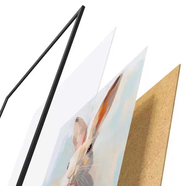 De poster bestaat uit een frame, plexiglas, geprinte afbeelding en spaanplaat achterkant. De poster kan meteen aan de muur worden gehangen dankzij de bevestigingen op de achterkant.