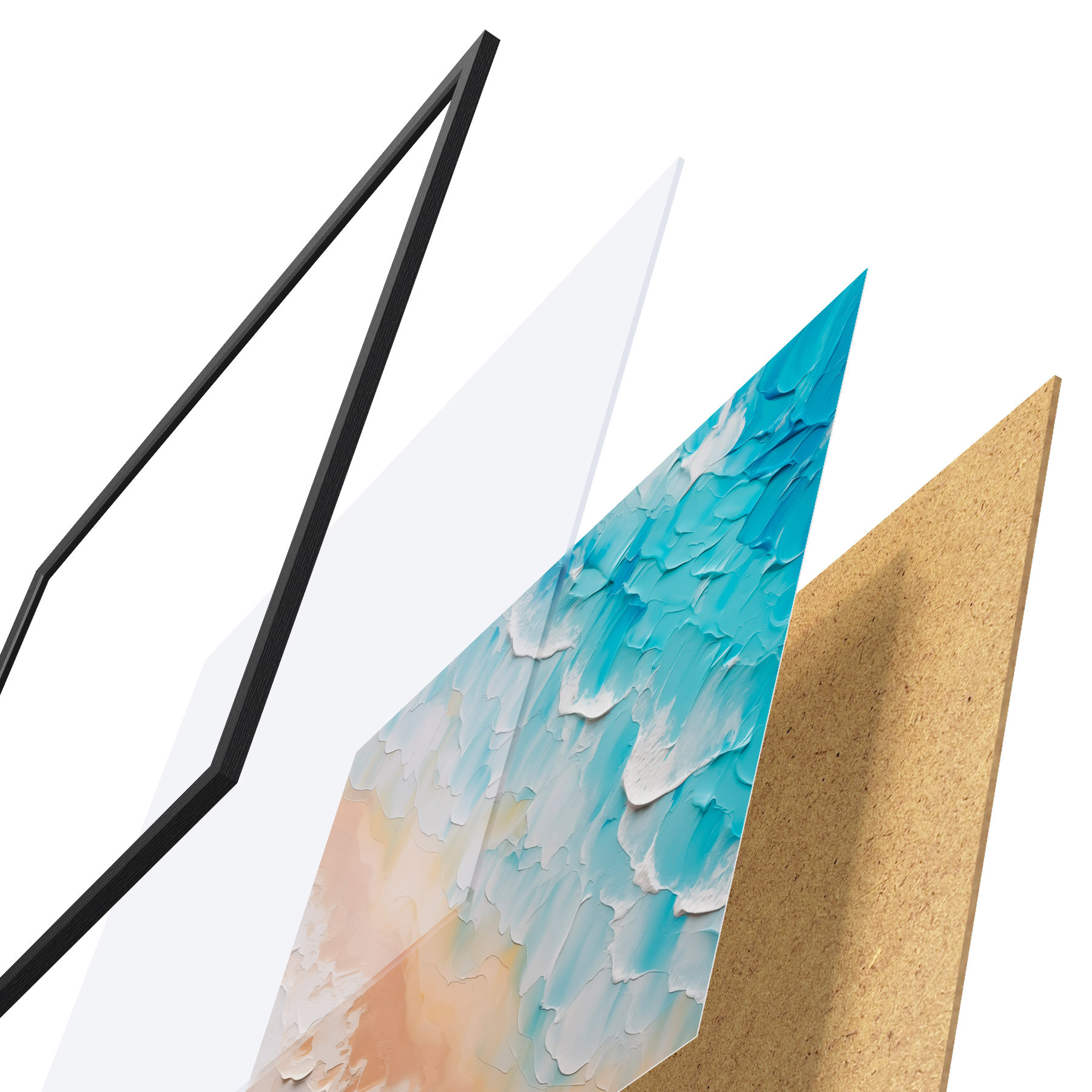 De poster bestaat uit een frame, plexiglas, geprinte afbeelding en spaanplaat achterkant. De poster kan meteen aan de muur worden gehangen dankzij de bevestigingen op de achterkant.