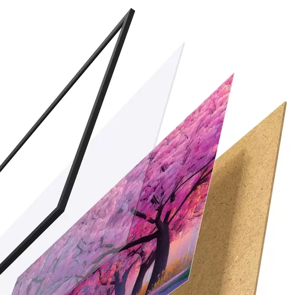 De poster bestaat uit een frame, plexiglas, geprinte afbeelding en spaanplaat achterkant. De poster kan meteen aan de muur worden gehangen dankzij de bevestigingen op de achterkant.