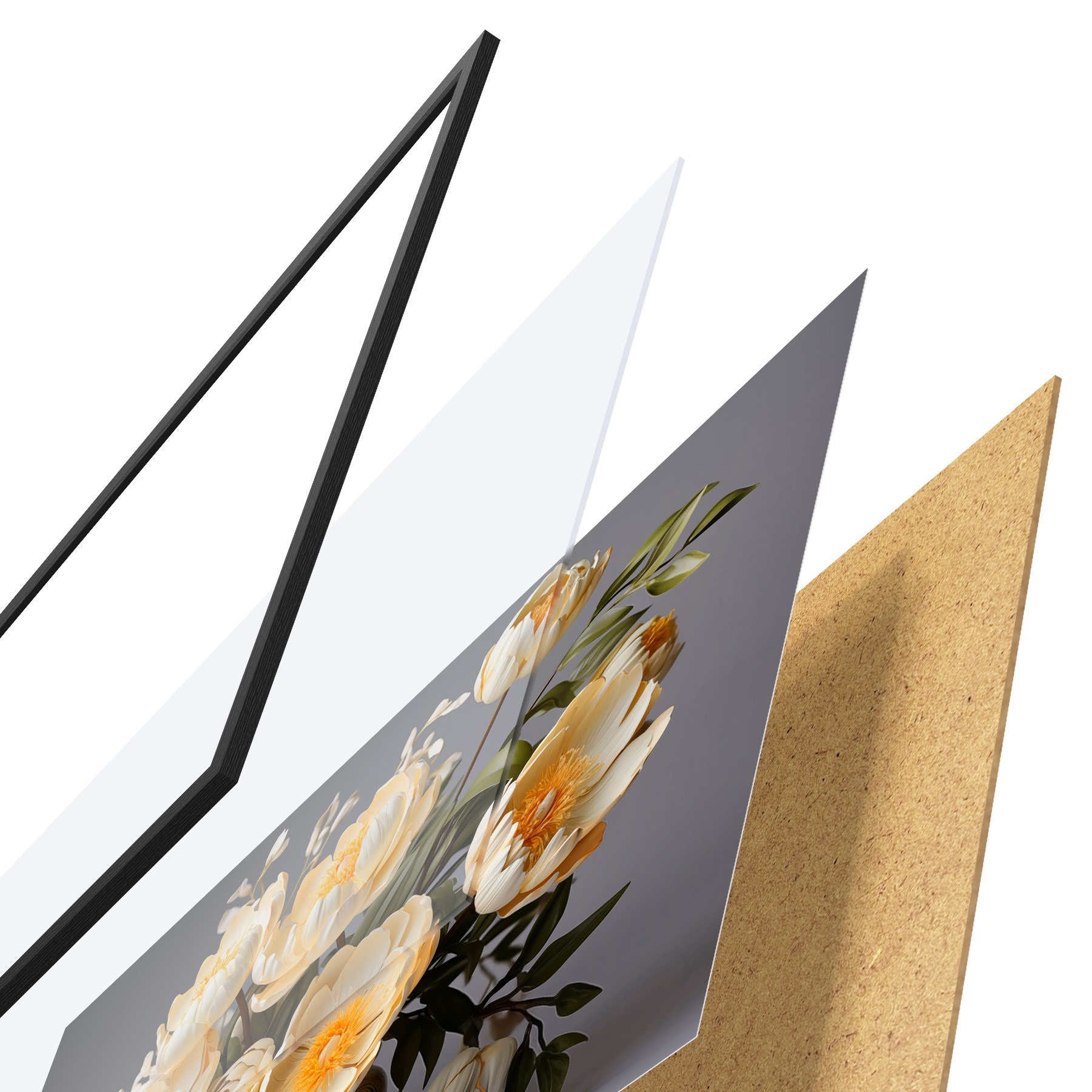 De poster bestaat uit een frame, plexiglas, geprinte afbeelding en spaanplaat achterkant. De poster kan meteen aan de muur worden gehangen dankzij de bevestigingen op de achterkant.