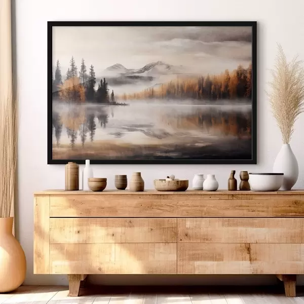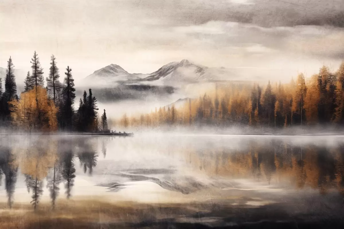 Poster Een mistig meerlandschap met dennenbomen en bergen, bewolkte grijze lucht Nr f44856
