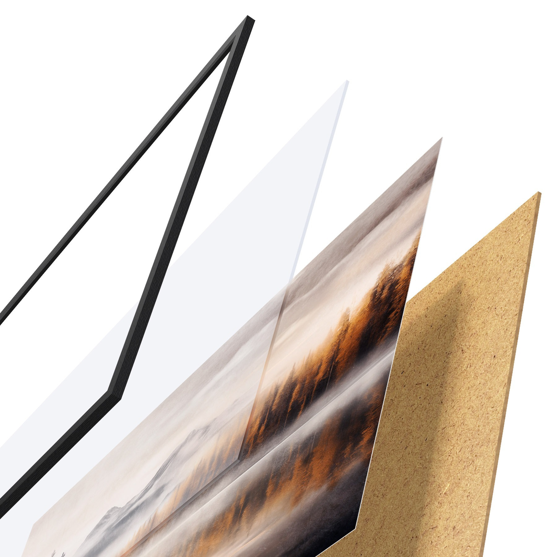 De poster bestaat uit een frame, plexiglas, geprinte afbeelding en spaanplaat achterkant. De poster kan meteen aan de muur worden gehangen dankzij de bevestigingen op de achterkant.