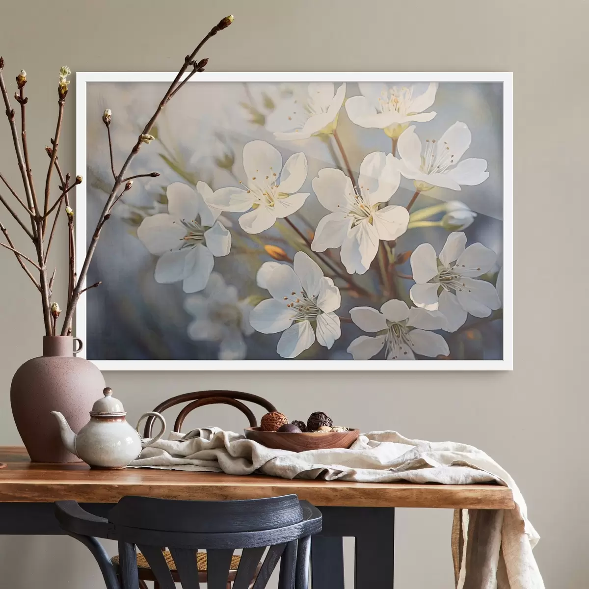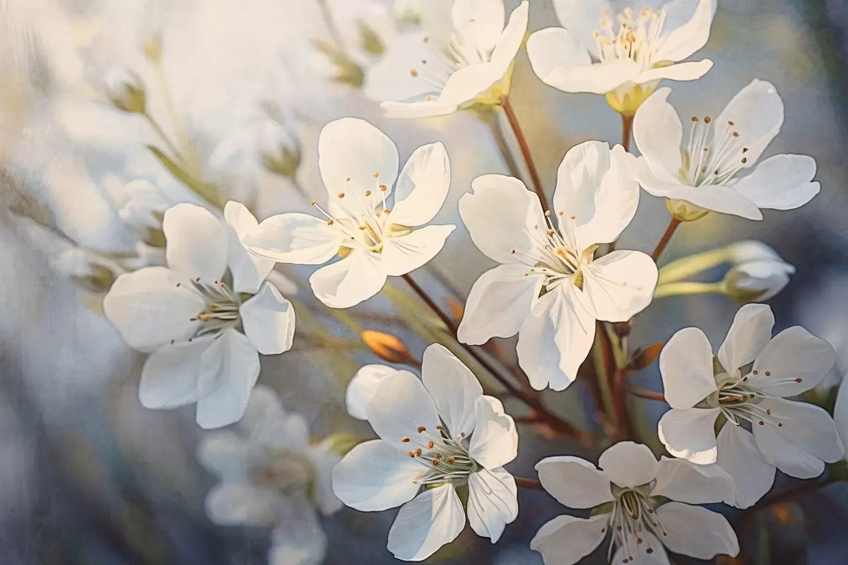 Poster Witte getextureerde kersenbloesems in aquarelstijl, delicate bloemblaadjes, lenteseizoen Nr f44859