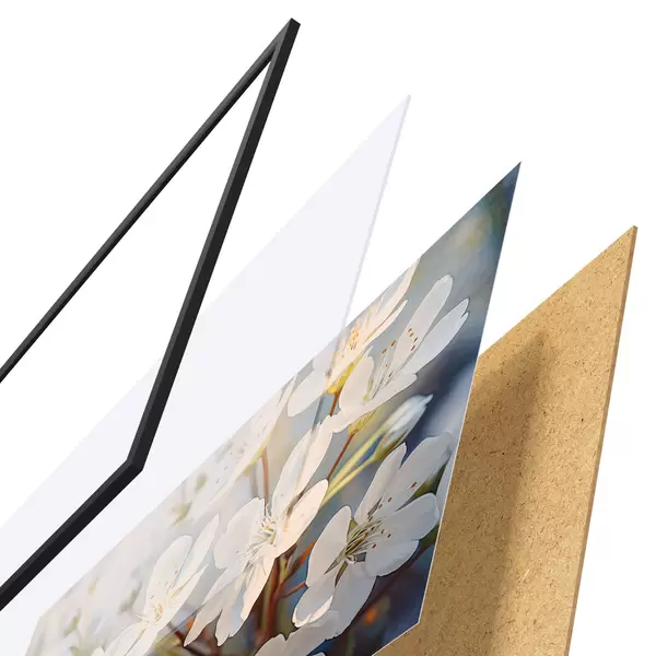 De poster bestaat uit een frame, plexiglas, geprinte afbeelding en spaanplaat achterkant. De poster kan meteen aan de muur worden gehangen dankzij de bevestigingen op de achterkant.