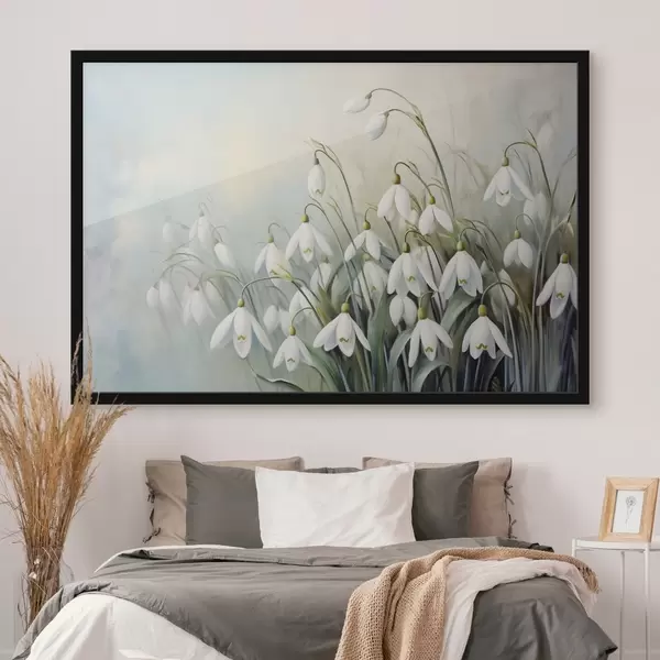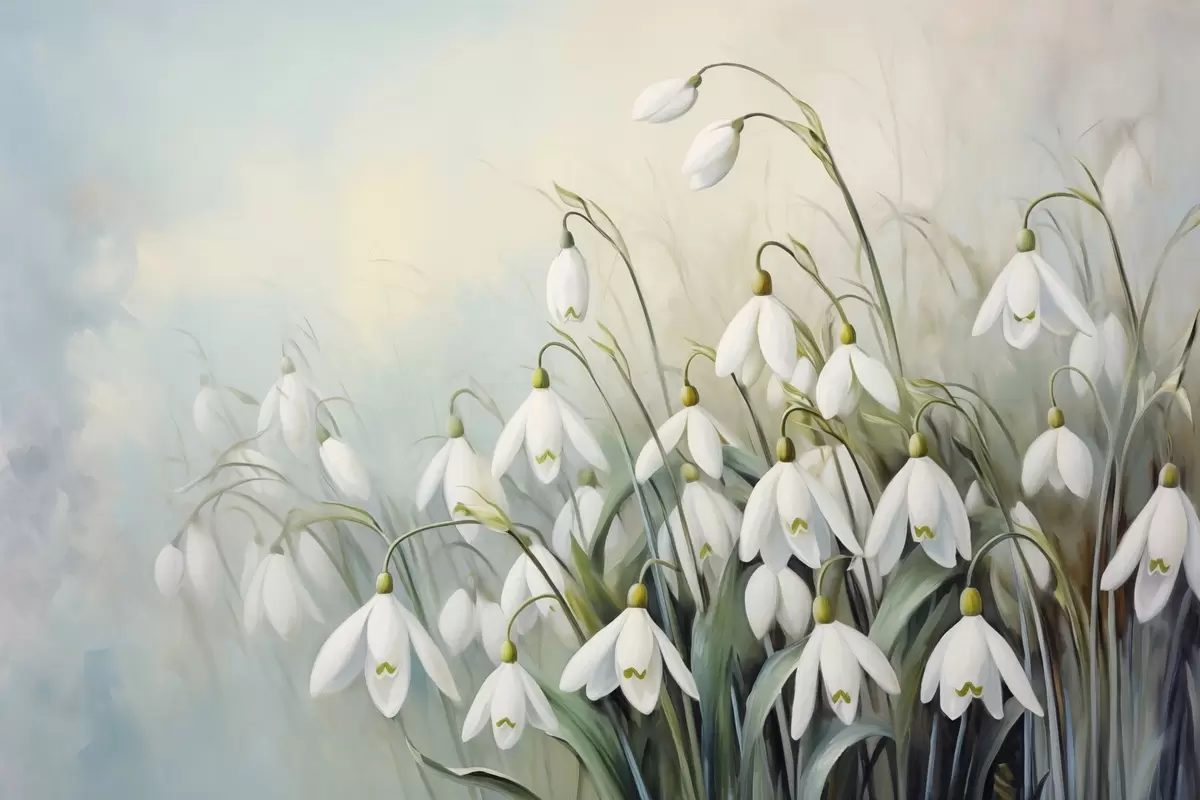 Poster Witte sneeuwklokjesbloemen met blauwe en groene stengels en bladeren, zachte penseelstreken, onscherpe achtergrond Nr f44864