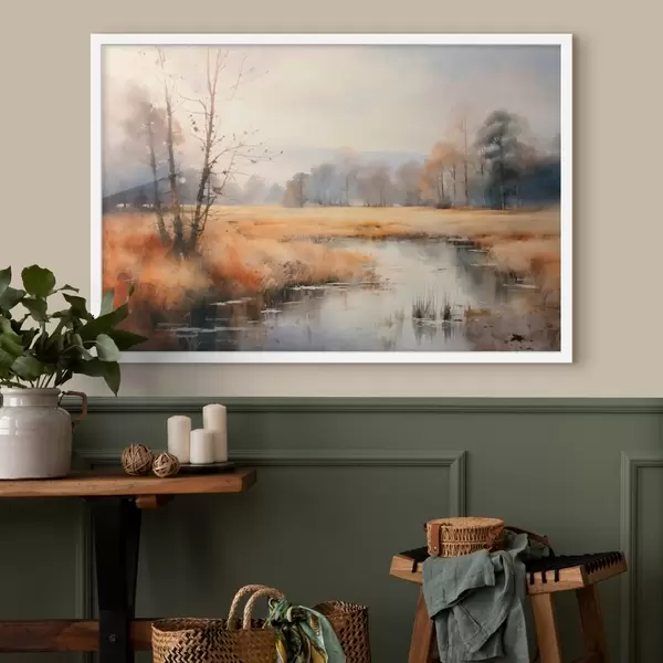 Poster Een rustig landschapschilderij met textuur, imitatie van riet en kale bomen, het kalme water onder een hemel Nr f44867