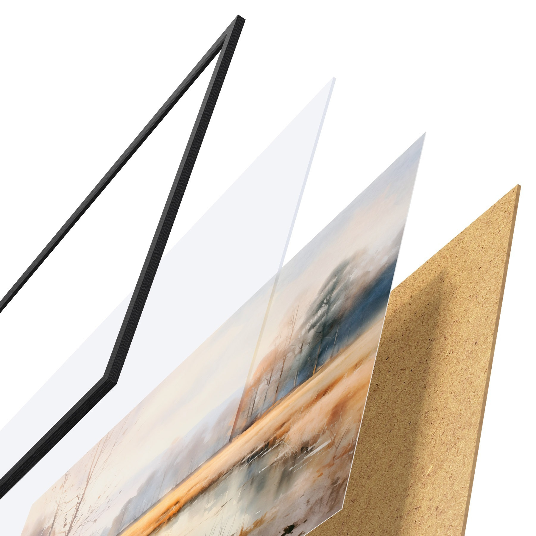 De poster bestaat uit een frame, plexiglas, geprinte afbeelding en spaanplaat achterkant. De poster kan meteen aan de muur worden gehangen dankzij de bevestigingen op de achterkant.
