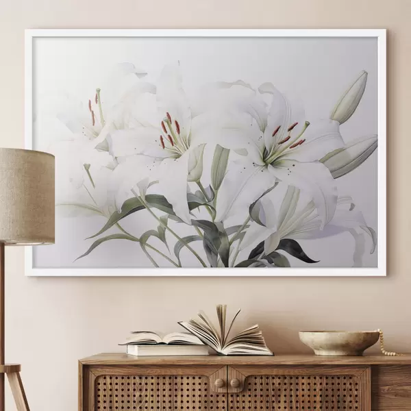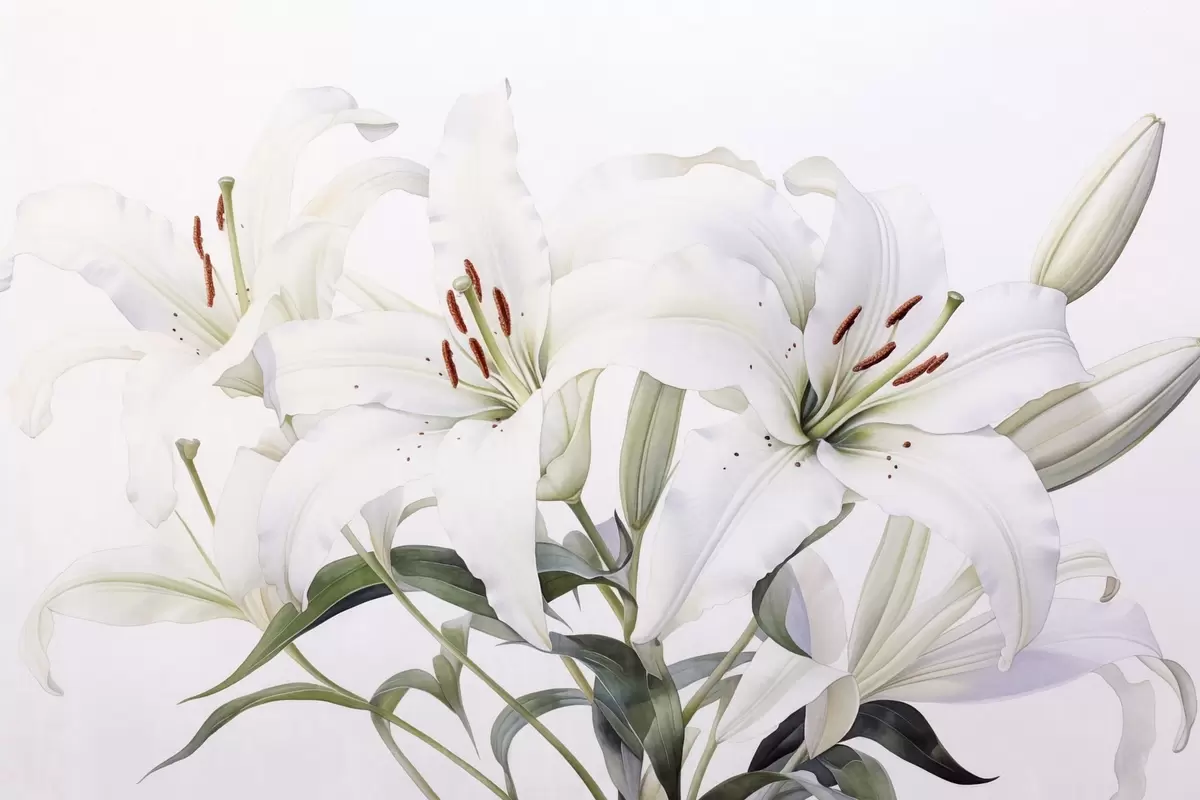 Poster Een boeket van witte lelies met groene bladeren, delicate bloemblaadjes en zachte witte achtergrond Nr f44868