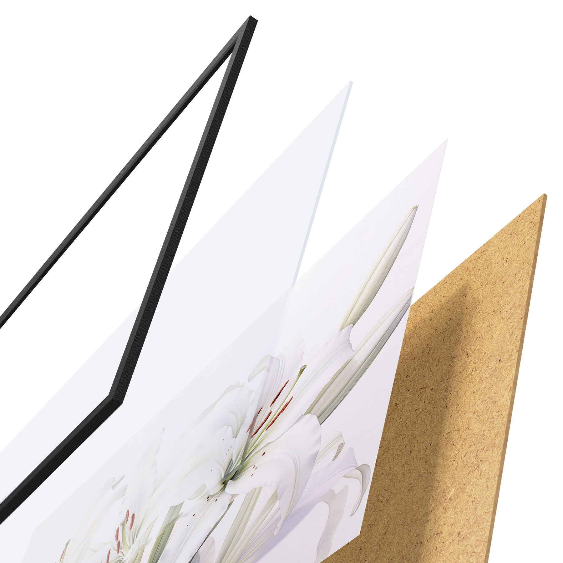 De poster bestaat uit een frame, plexiglas, geprinte afbeelding en spaanplaat achterkant. De poster kan meteen aan de muur worden gehangen dankzij de bevestigingen op de achterkant.