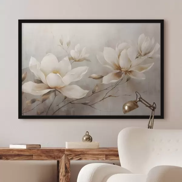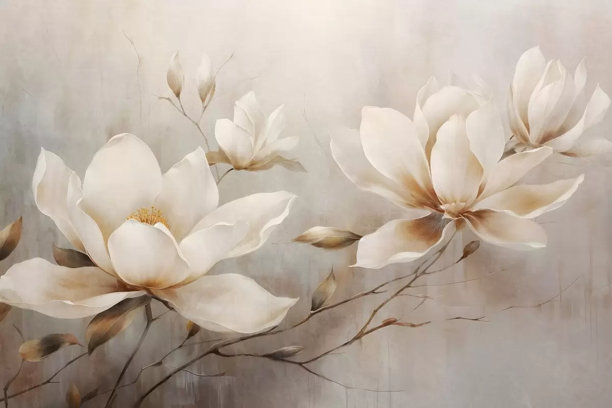 Poster Textured vintage witte magnolia bloemen op takken in een lichtbruine achtergrond Nr f44869