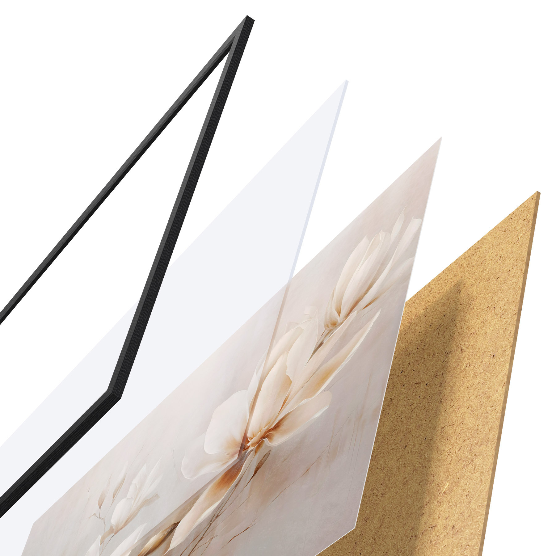 De poster bestaat uit een frame, plexiglas, geprinte afbeelding en spaanplaat achterkant. De poster kan meteen aan de muur worden gehangen dankzij de bevestigingen op de achterkant.