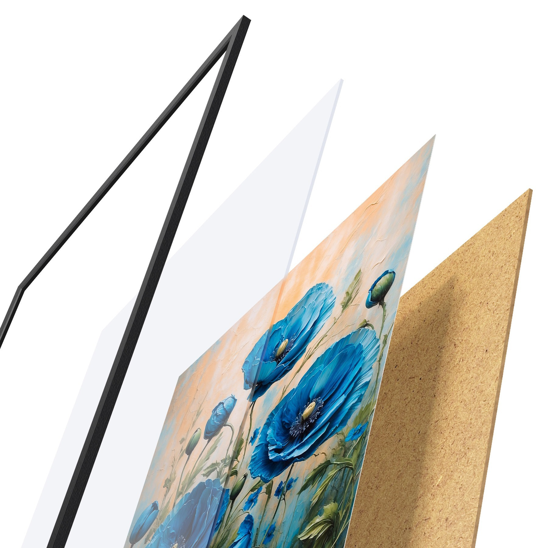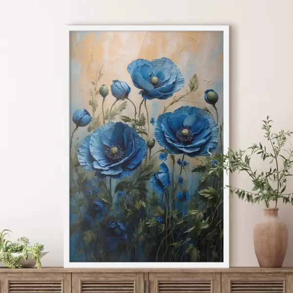 Poster Blauwe klaprozen op een pastelkleurige achtergrond met bladeren Nr f44882