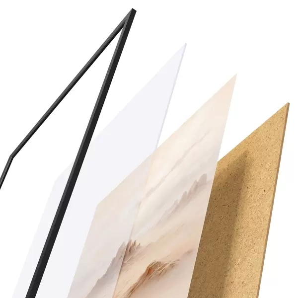 De poster bestaat uit een frame, plexiglas, geprinte afbeelding en spaanplaat achterkant. De poster kan meteen aan de muur worden gehangen dankzij de bevestigingen op de achterkant.