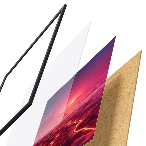 De poster bestaat uit een frame, plexiglas, geprinte afbeelding en spaanplaat achterkant. De poster kan meteen aan de muur worden gehangen dankzij de bevestigingen op de achterkant.