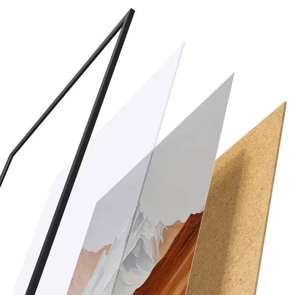 De poster bestaat uit een frame, plexiglas, geprinte afbeelding en spaanplaat achterkant. De poster kan meteen aan de muur worden gehangen dankzij de bevestigingen op de achterkant.