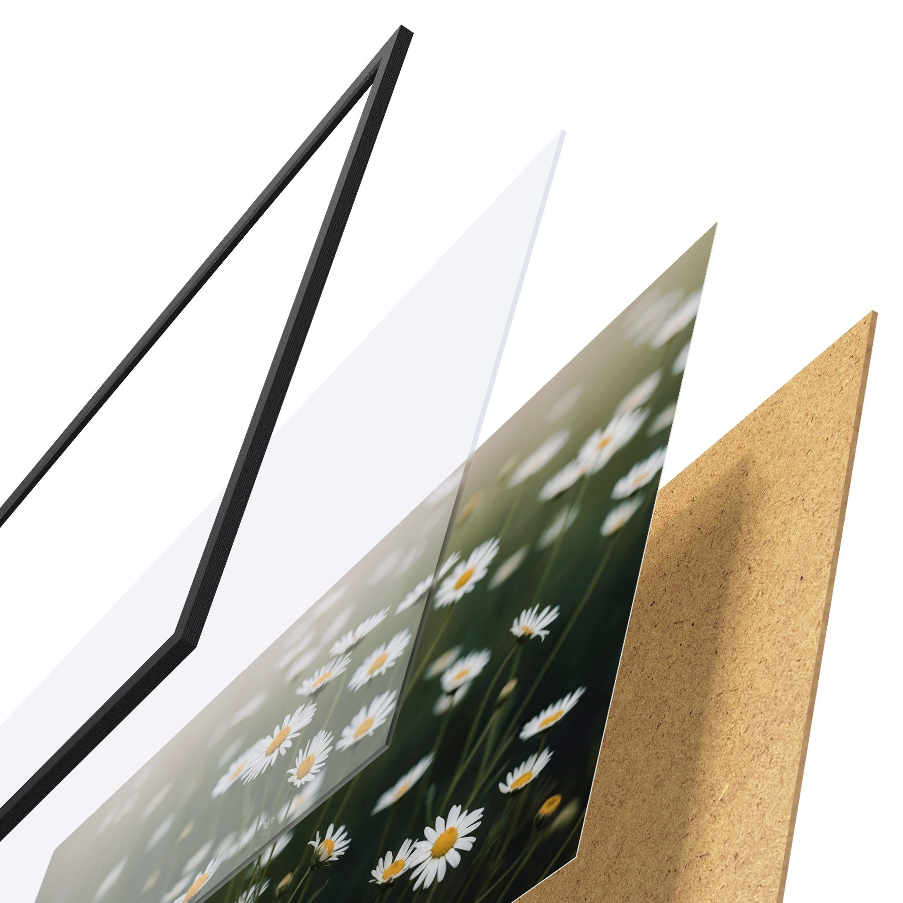De poster bestaat uit een frame, plexiglas, geprinte afbeelding en spaanplaat achterkant. De poster kan meteen aan de muur worden gehangen dankzij de bevestigingen op de achterkant.