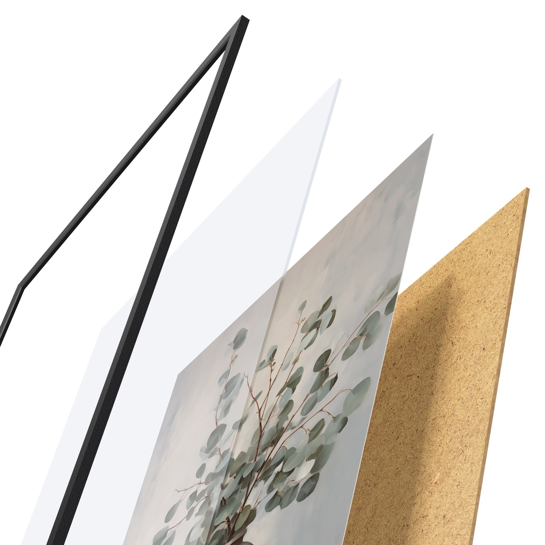 De poster bestaat uit een frame, plexiglas, geprinte afbeelding en spaanplaat achterkant. De poster kan meteen aan de muur worden gehangen dankzij de bevestigingen op de achterkant.
