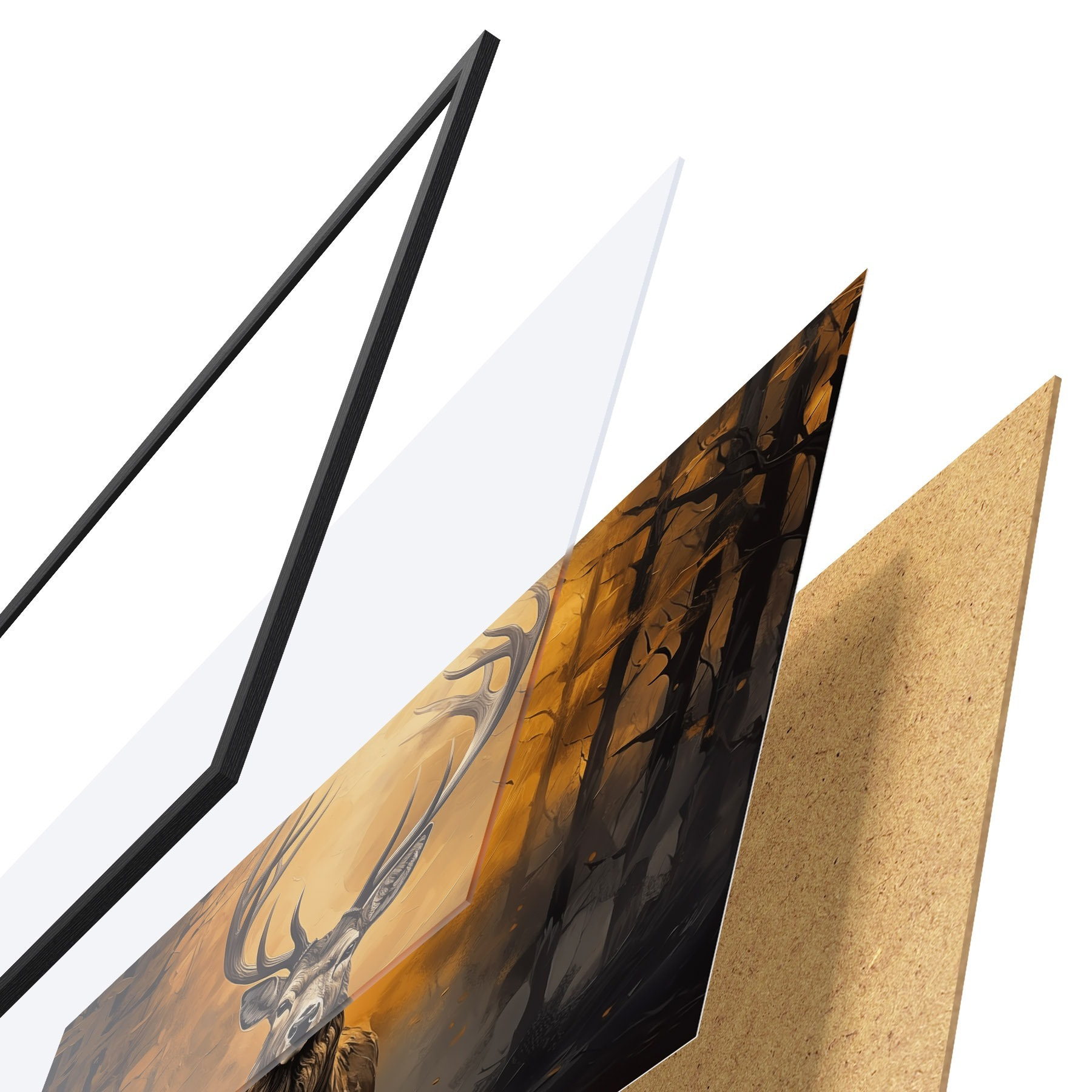 De poster bestaat uit een frame, plexiglas, geprinte afbeelding en spaanplaat achterkant. De poster kan meteen aan de muur worden gehangen dankzij de bevestigingen op de achterkant.