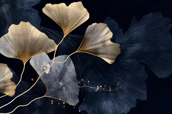 Poster Ginkgo bladeren in gele en blauwe tinten, elegante donkere achtergrond, moderne kunst, minimalistische stijl, op de natuur geïnspireerd Nr f44921