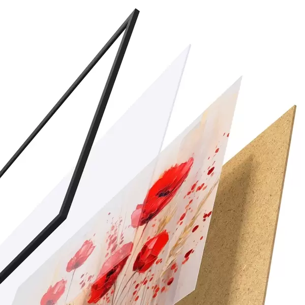De poster bestaat uit een frame, plexiglas, geprinte afbeelding en spaanplaat achterkant. De poster kan meteen aan de muur worden gehangen dankzij de bevestigingen op de achterkant.