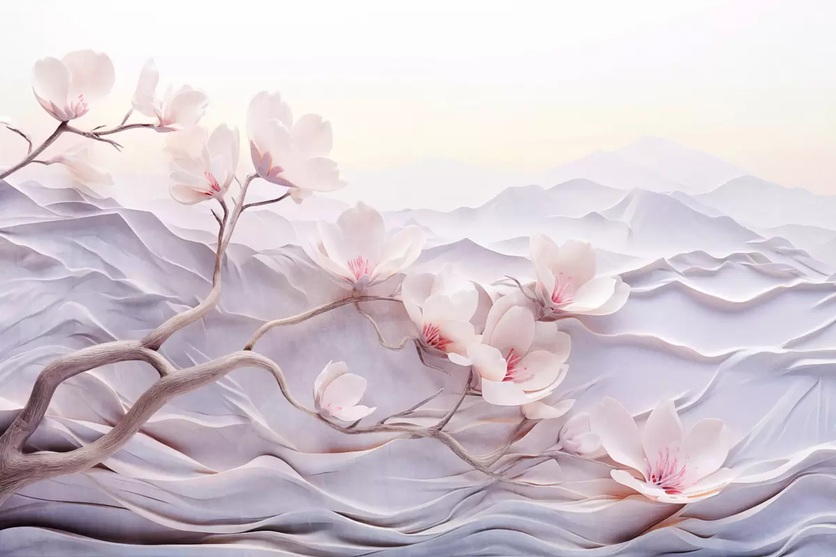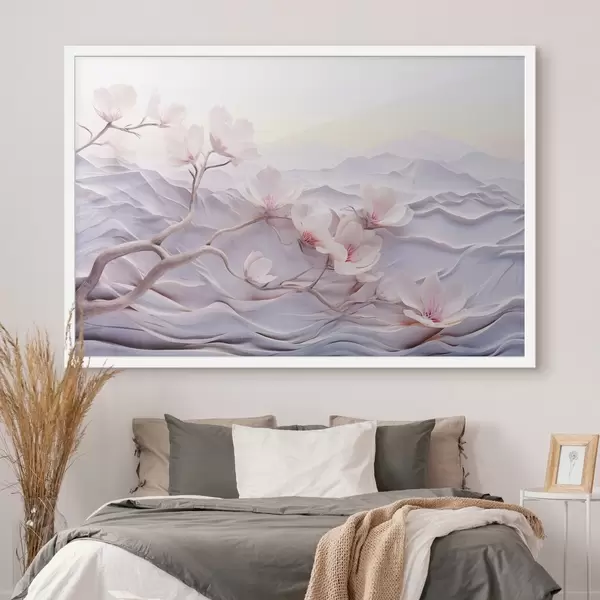Poster Bloesemtak met roze bloemen, bergen op de achtergrond, zachte pastelkleuren, Japanse textuurkunst f44930