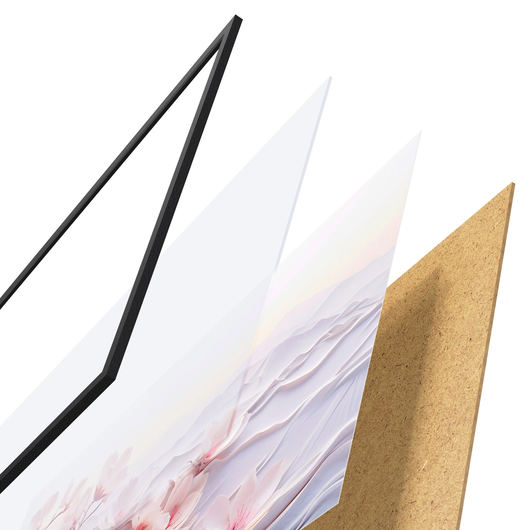 De poster bestaat uit een frame, plexiglas, geprinte afbeelding en spaanplaat achterkant. De poster kan meteen aan de muur worden gehangen dankzij de bevestigingen op de achterkant.