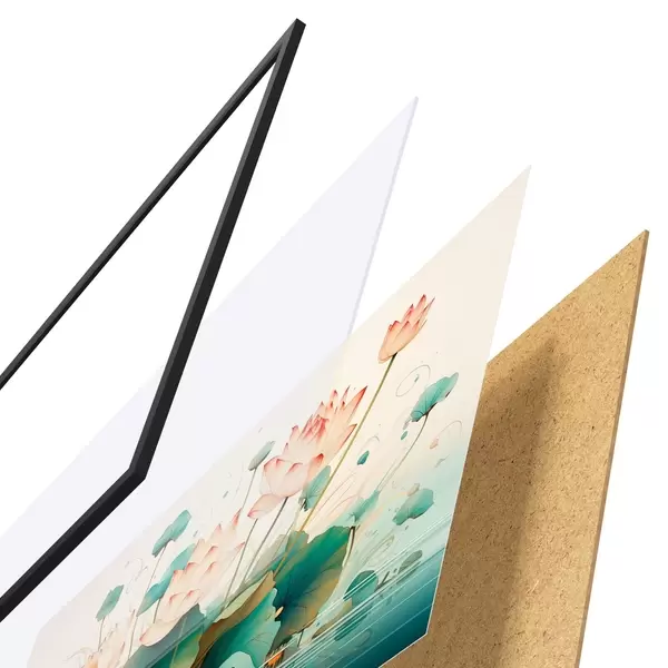 De poster bestaat uit een frame, plexiglas, geprinte afbeelding en spaanplaat achterkant. De poster kan meteen aan de muur worden gehangen dankzij de bevestigingen op de achterkant.