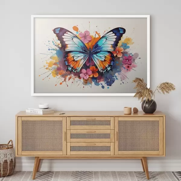 Poster Dynamische compositie van een vlinder en bloemenvlekken in kunststijl Nr f44943