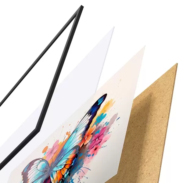 De poster bestaat uit een frame, plexiglas, geprinte afbeelding en spaanplaat achterkant. De poster kan meteen aan de muur worden gehangen dankzij de bevestigingen op de achterkant.