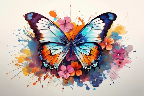 Poster Dynamische compositie van een vlinder en bloemenvlekken in kunststijl Nr f44943