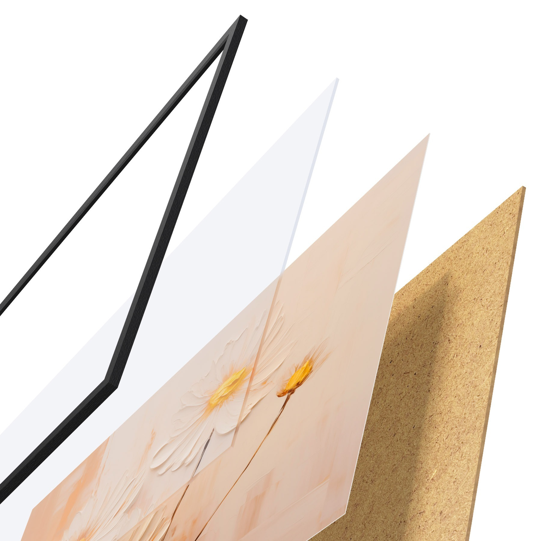 De poster bestaat uit een frame, plexiglas, geprinte afbeelding en spaanplaat achterkant. De poster kan meteen aan de muur worden gehangen dankzij de bevestigingen op de achterkant.