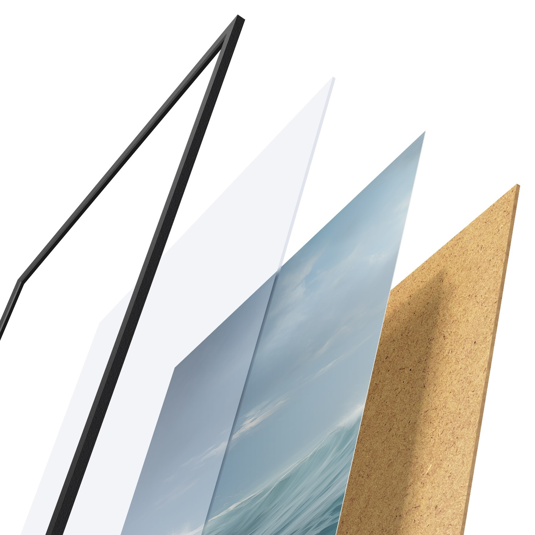 De poster bestaat uit een frame, plexiglas, geprinte afbeelding en spaanplaat achterkant. De poster kan meteen aan de muur worden gehangen dankzij de bevestigingen op de achterkant.