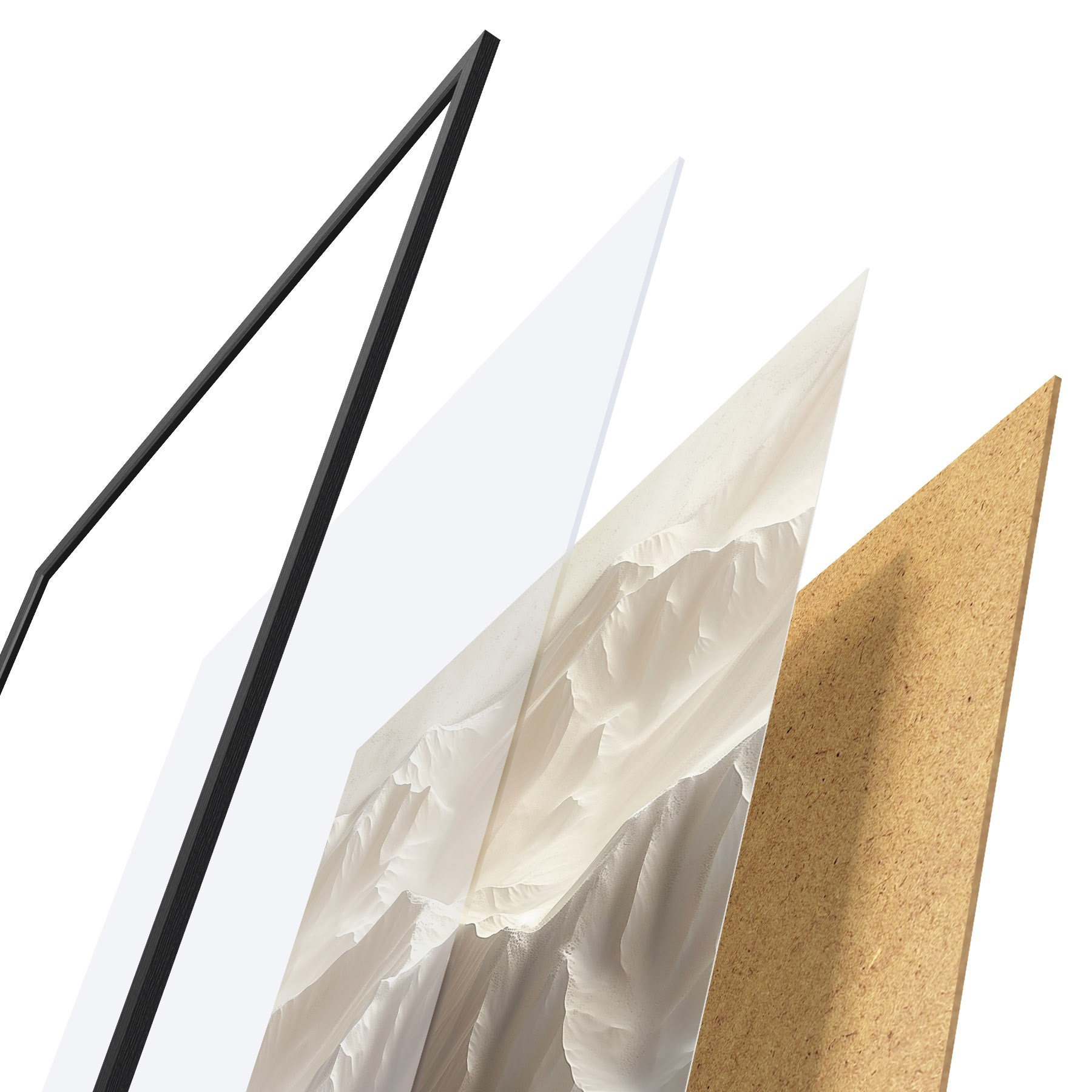 De poster bestaat uit een frame, plexiglas, geprinte afbeelding en spaanplaat achterkant. De poster kan meteen aan de muur worden gehangen dankzij de bevestigingen op de achterkant.