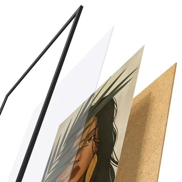 De poster bestaat uit een frame, plexiglas, geprinte afbeelding en spaanplaat achterkant. De poster kan meteen aan de muur worden gehangen dankzij de bevestigingen op de achterkant.