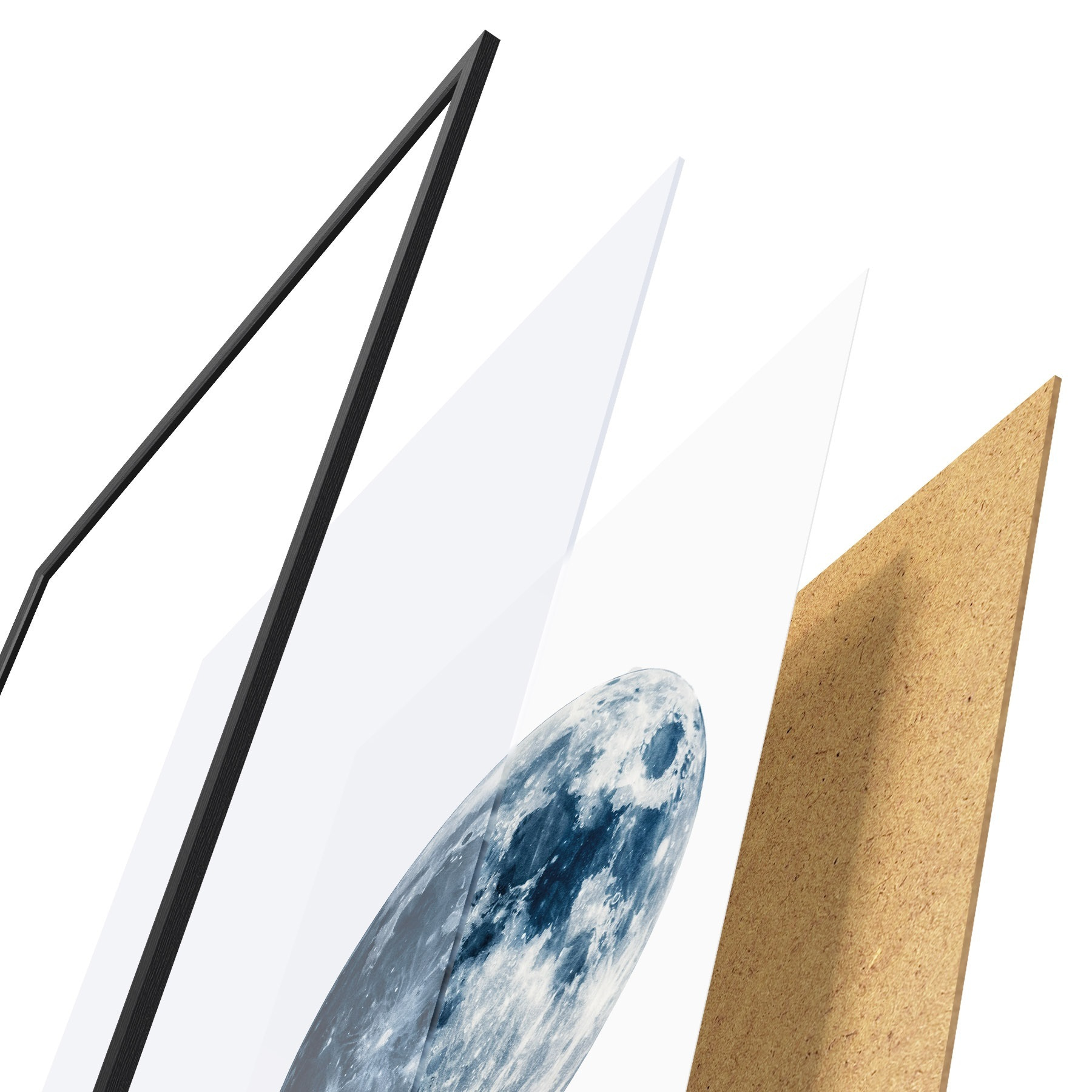 De poster bestaat uit een frame, plexiglas, geprinte afbeelding en spaanplaat achterkant. De poster kan meteen aan de muur worden gehangen dankzij de bevestigingen op de achterkant.