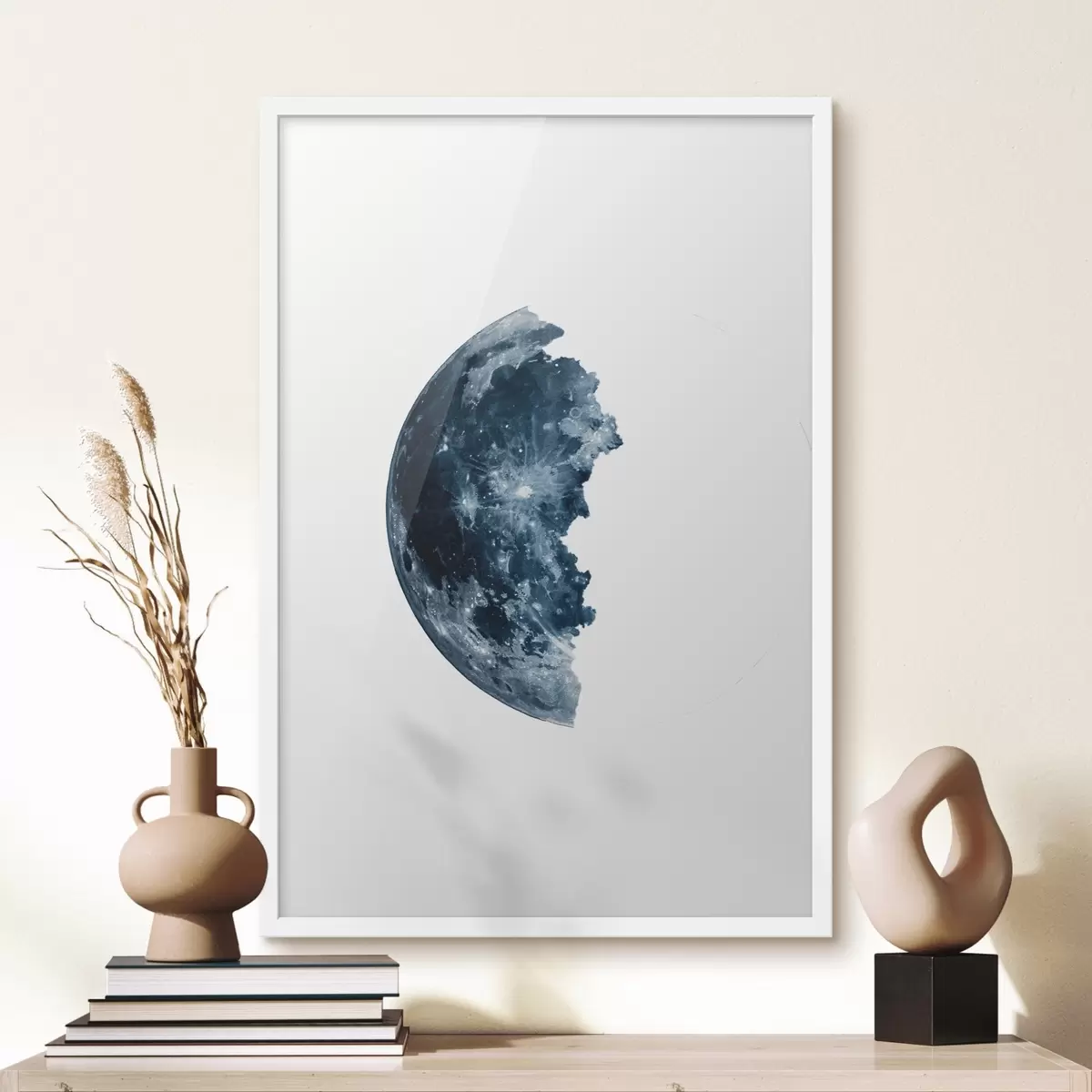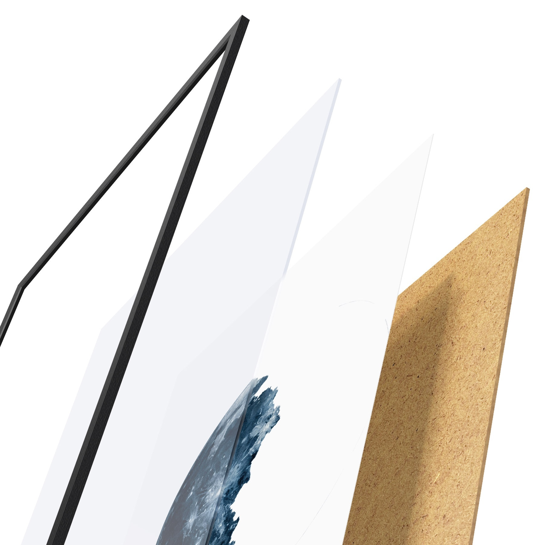 De poster bestaat uit een frame, plexiglas, geprinte afbeelding en spaanplaat achterkant. De poster kan meteen aan de muur worden gehangen dankzij de bevestigingen op de achterkant.