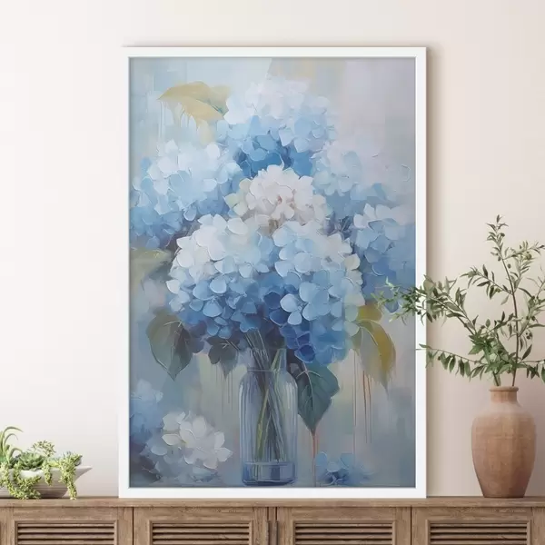 Poster Boeket van blauwe hortensia in een glazen vaas Nr f44998
