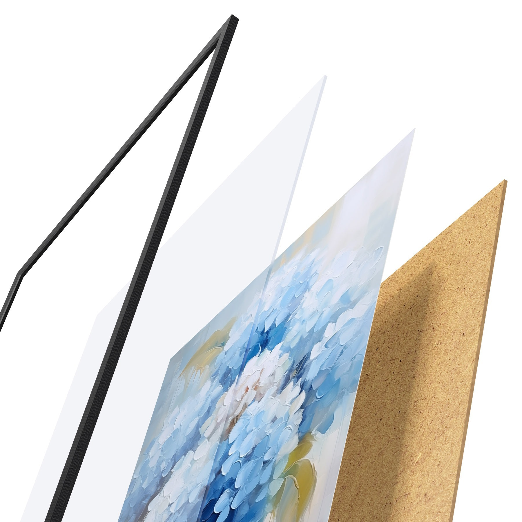 De poster bestaat uit een frame, plexiglas, geprinte afbeelding en spaanplaat achterkant. De poster kan meteen aan de muur worden gehangen dankzij de bevestigingen op de achterkant.
