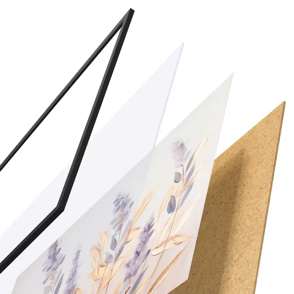 De poster bestaat uit een frame, plexiglas, geprinte afbeelding en spaanplaat achterkant. De poster kan meteen aan de muur worden gehangen dankzij de bevestigingen op de achterkant.