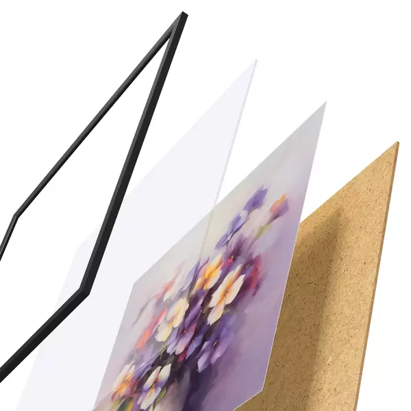 De poster bestaat uit een frame, plexiglas, geprinte afbeelding en spaanplaat achterkant. De poster kan meteen aan de muur worden gehangen dankzij de bevestigingen op de achterkant.