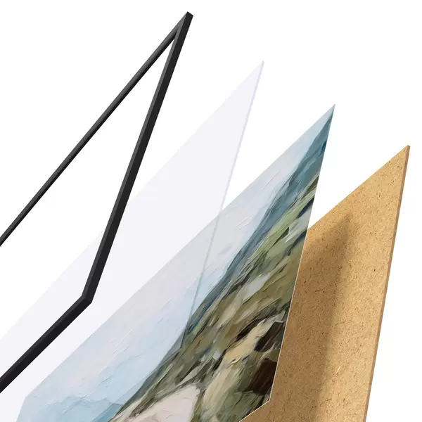 De poster bestaat uit een frame, plexiglas, geprinte afbeelding en spaanplaat achterkant. De poster kan meteen aan de muur worden gehangen dankzij de bevestigingen op de achterkant.
