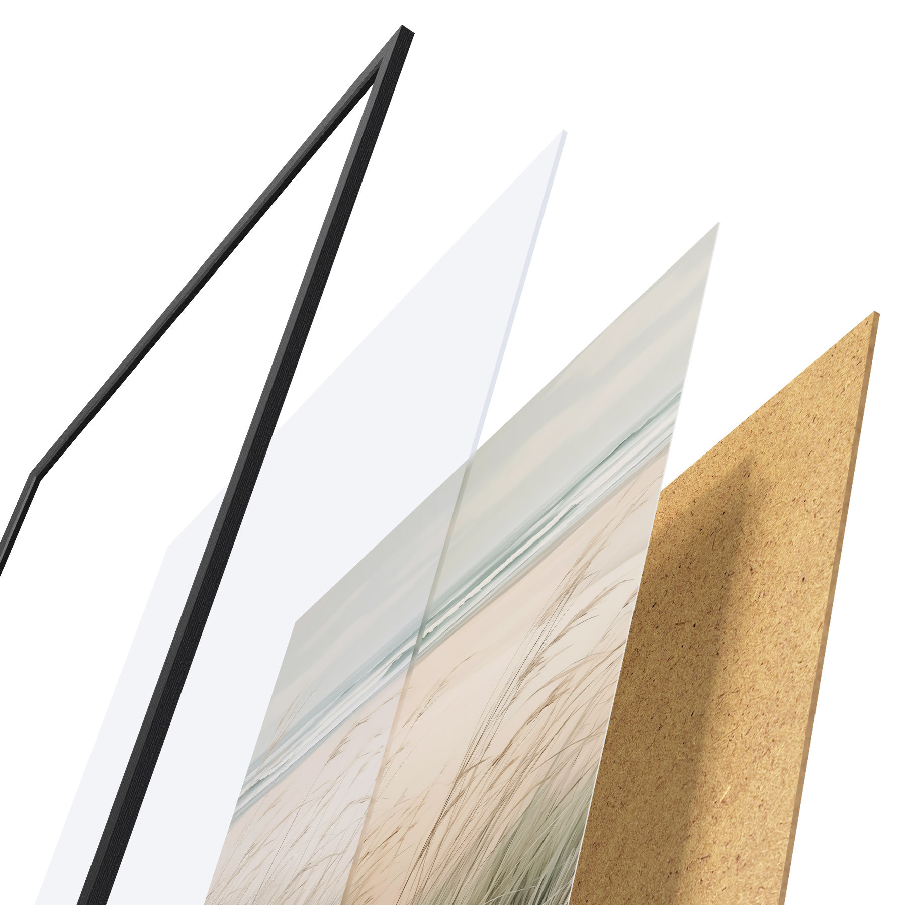 De poster bestaat uit een frame, plexiglas, geprinte afbeelding en spaanplaat achterkant. De poster kan meteen aan de muur worden gehangen dankzij de bevestigingen op de achterkant.